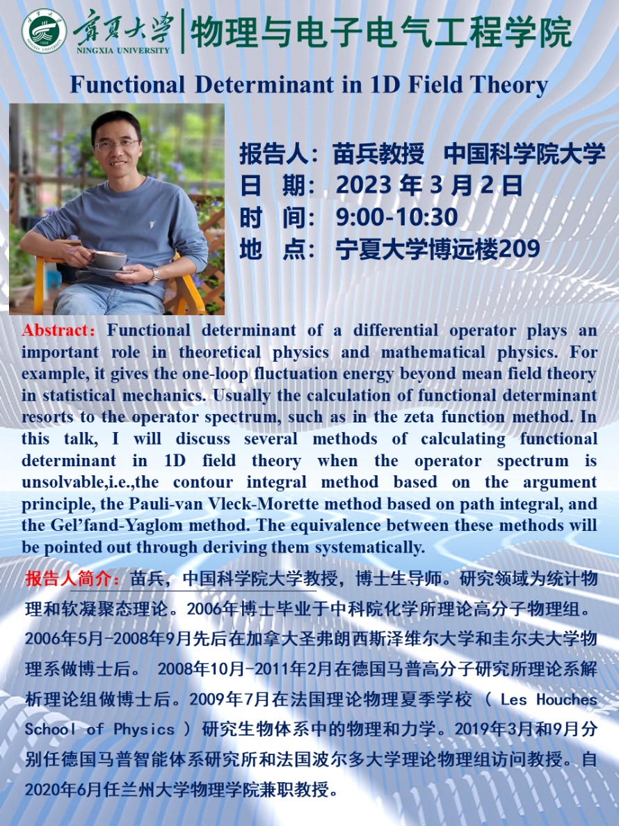 报告人简介:苗兵,中国科学院大学教授,博士生导师。研究领域为统计物理和软凝聚态理论。2006年博士毕业于中科院化学所理论高分子物理组。2006年5月-2008年9月先后在加拿大圣弗朗西斯泽维尔大学和圭尔夫大学物理系做博士后。2008年10月-2011年2月在德国马普高分子研究所理论系解析理论组做博士后。2009年7月在法国理论物理夏季学校( Les Houches School of Physics )研究生物体系中的物理和力学。2019年3月和9月分别任德国马普智能体系研究所和法国波尔多大学理论物理组访问教授。自2020年6月任兰州大学WilliamHILL中国兼职教授。