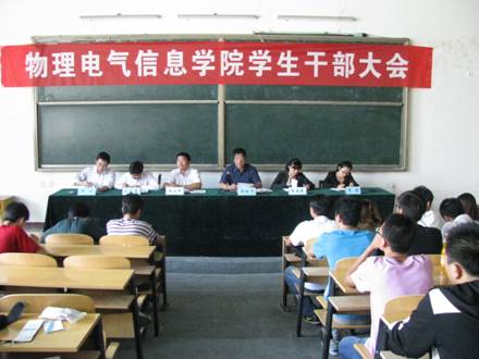 9月14日下午2:30,物理电气信息学院在B区基础物理实验中心106教室召开新学期学生干部大会。学院党总支书记郭振才,党总支副书记赵永军、李海燕,学生工作办公室主任王玉祥,团委书记常江和辅导员李瑾老师出席会议。