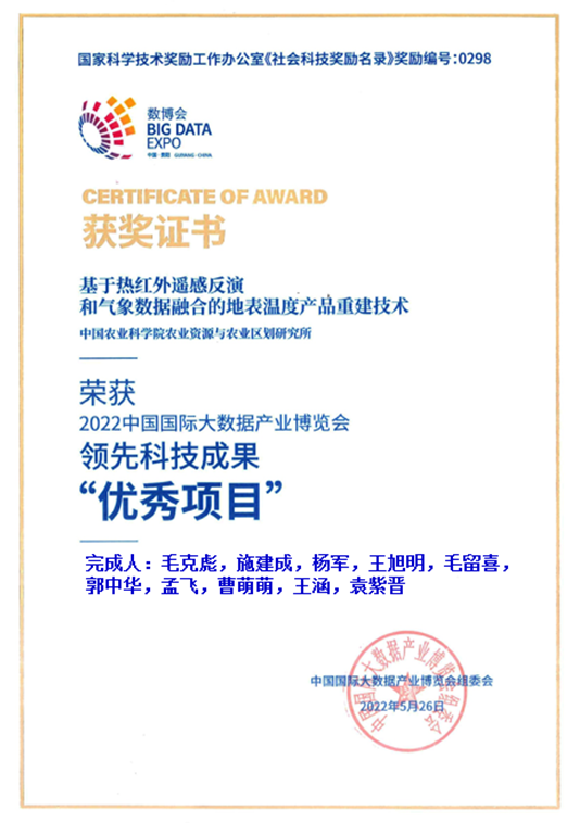 5月26日,2022中国国际大数据产业博览会领先科技成果奖正式揭晓。物理与电子电气工程学院参与中国农业科学院农业资源与农业区划研究所主持的 “基于热红外遥感反演和气象数据融合的地表温度产品重建技术”项目获2022数博会领先科技成果奖“优秀项目”奖项(完成单位:中国农业科学院农业资源与农业区划研究所、williamhill、国家卫星气象中心、中国科学院国家空间科学中心、国家气象中和山东建筑大学;主要完成人:毛克彪,施建成,杨军,王旭明,毛留喜,郭中华,孟飞,曹萌萌,王涵,袁紫晋等)。