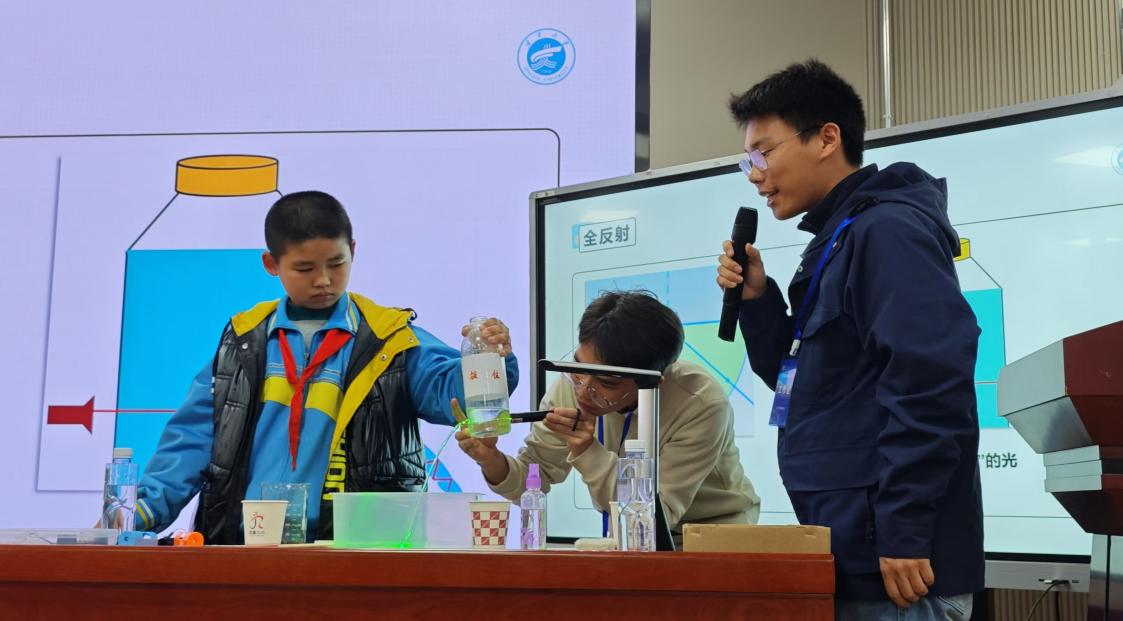 西夏区九小首先对高永伟副院长及其团队表示热烈欢迎,随后由团队成员带领现场同学登上“光的旅行号”,参与被“折断”的筷子、重现的硬币、锁住激光等趣味科学小实验,体验光学现象,领略科学魅力。最后,团队成员展示自制氢原子光谱演示仪,带领现场同学进一步认识光的产生原理。