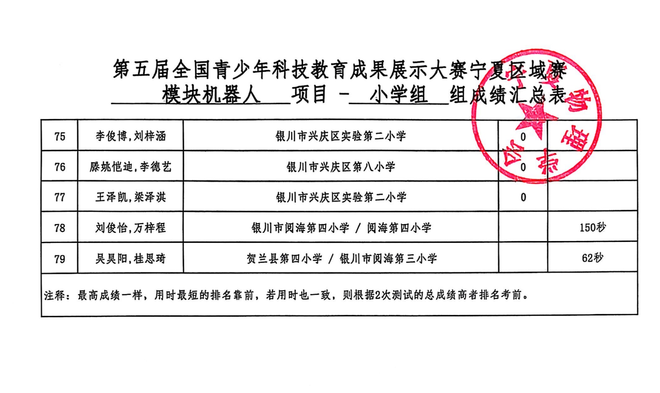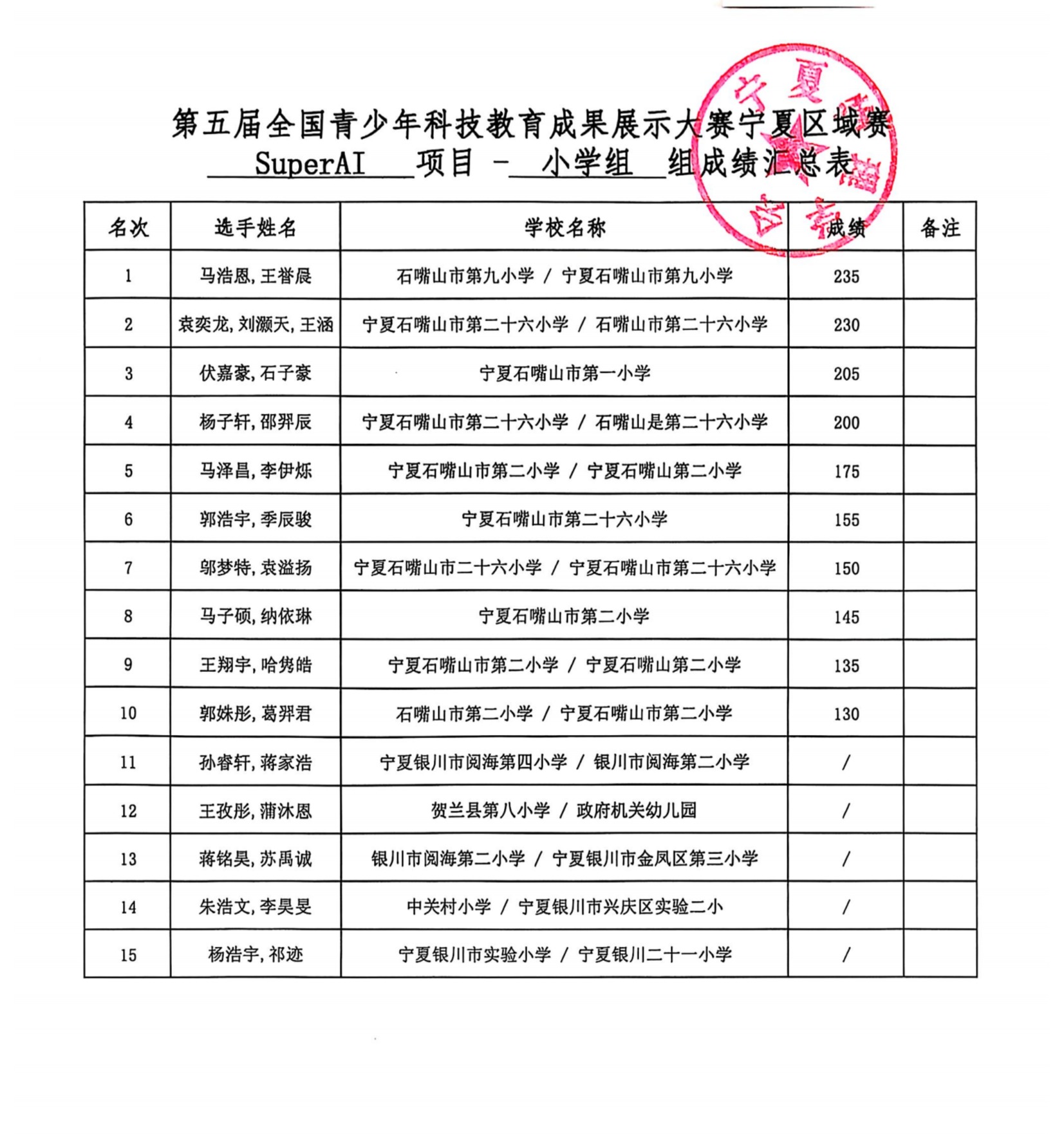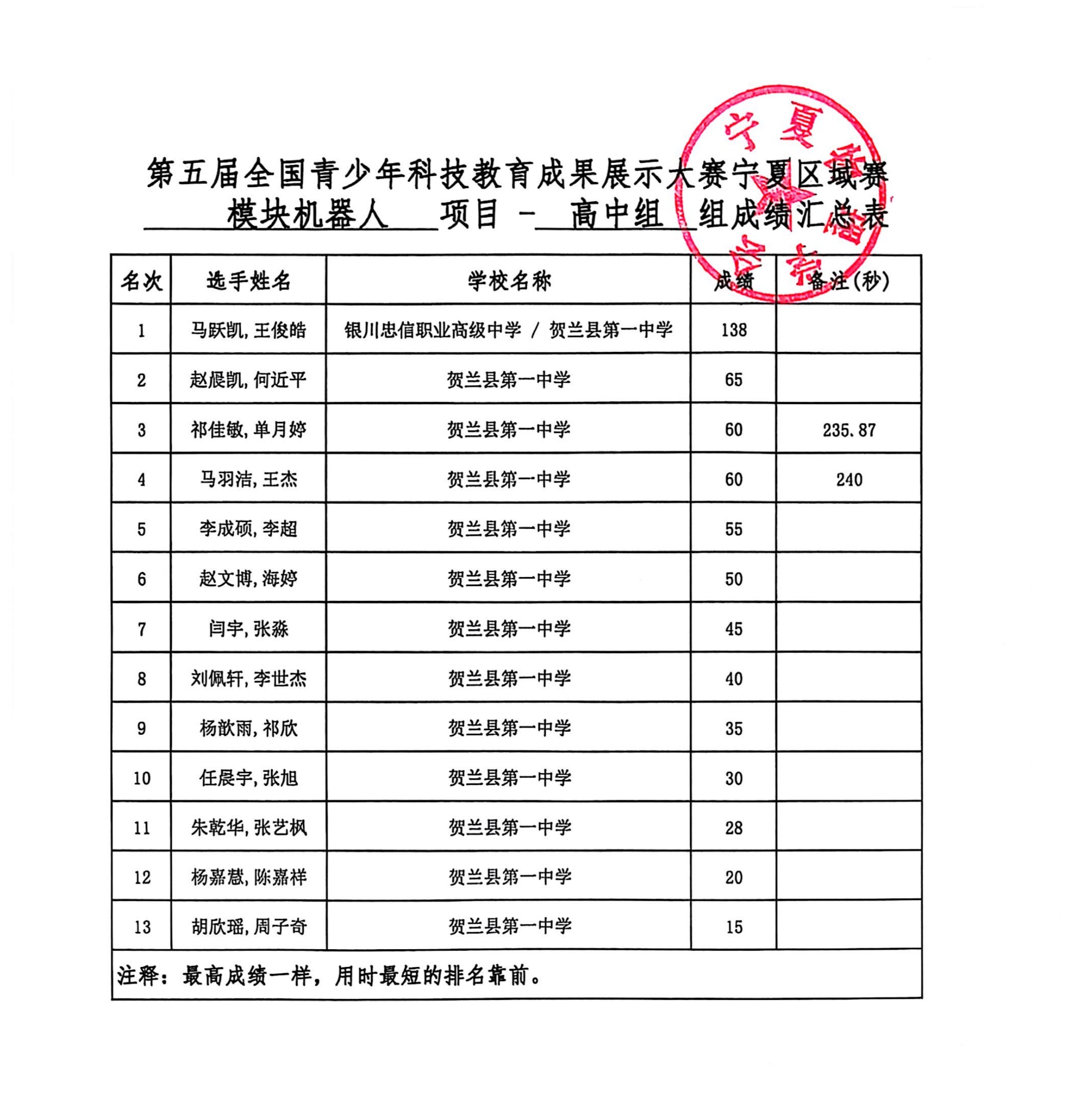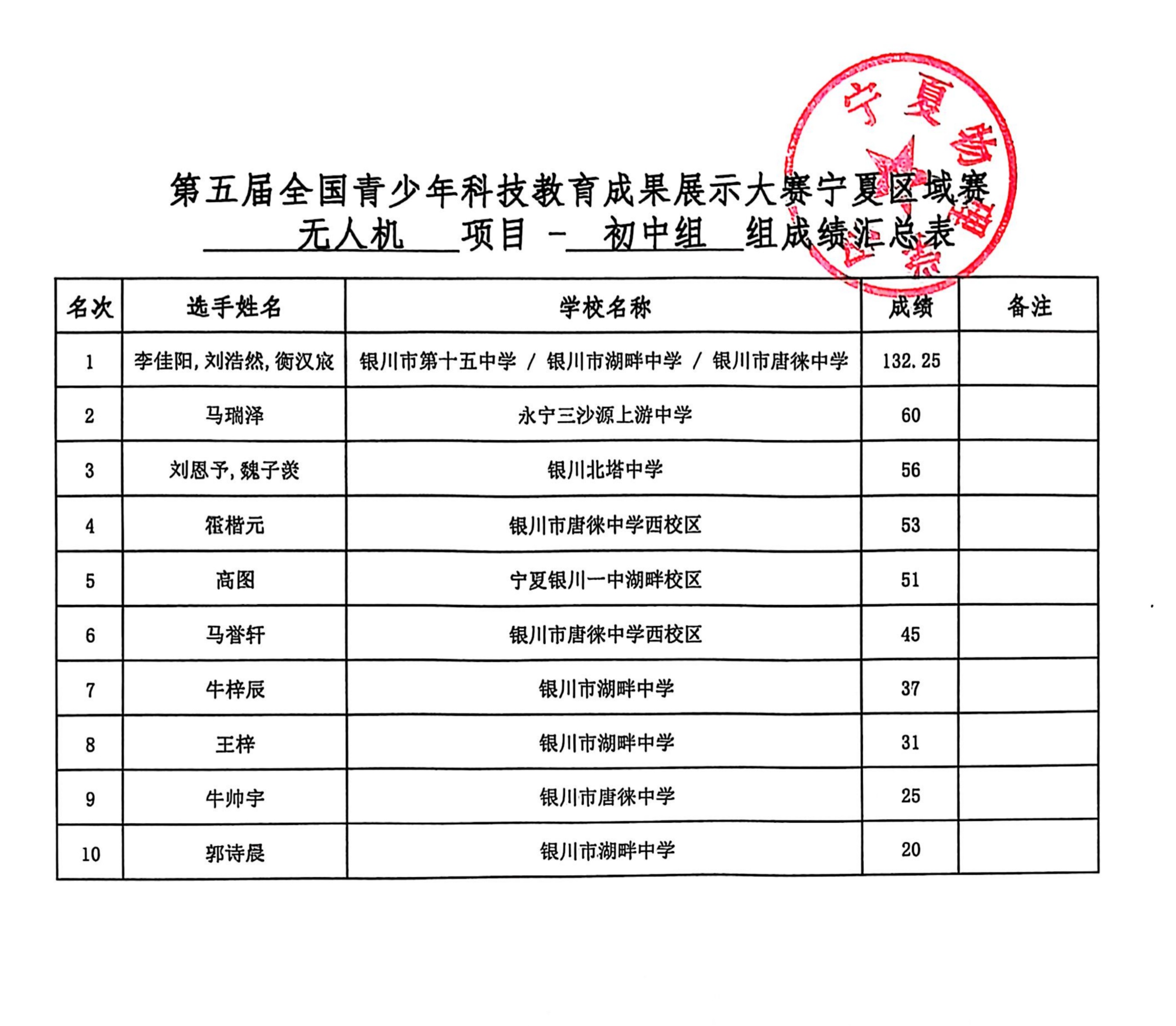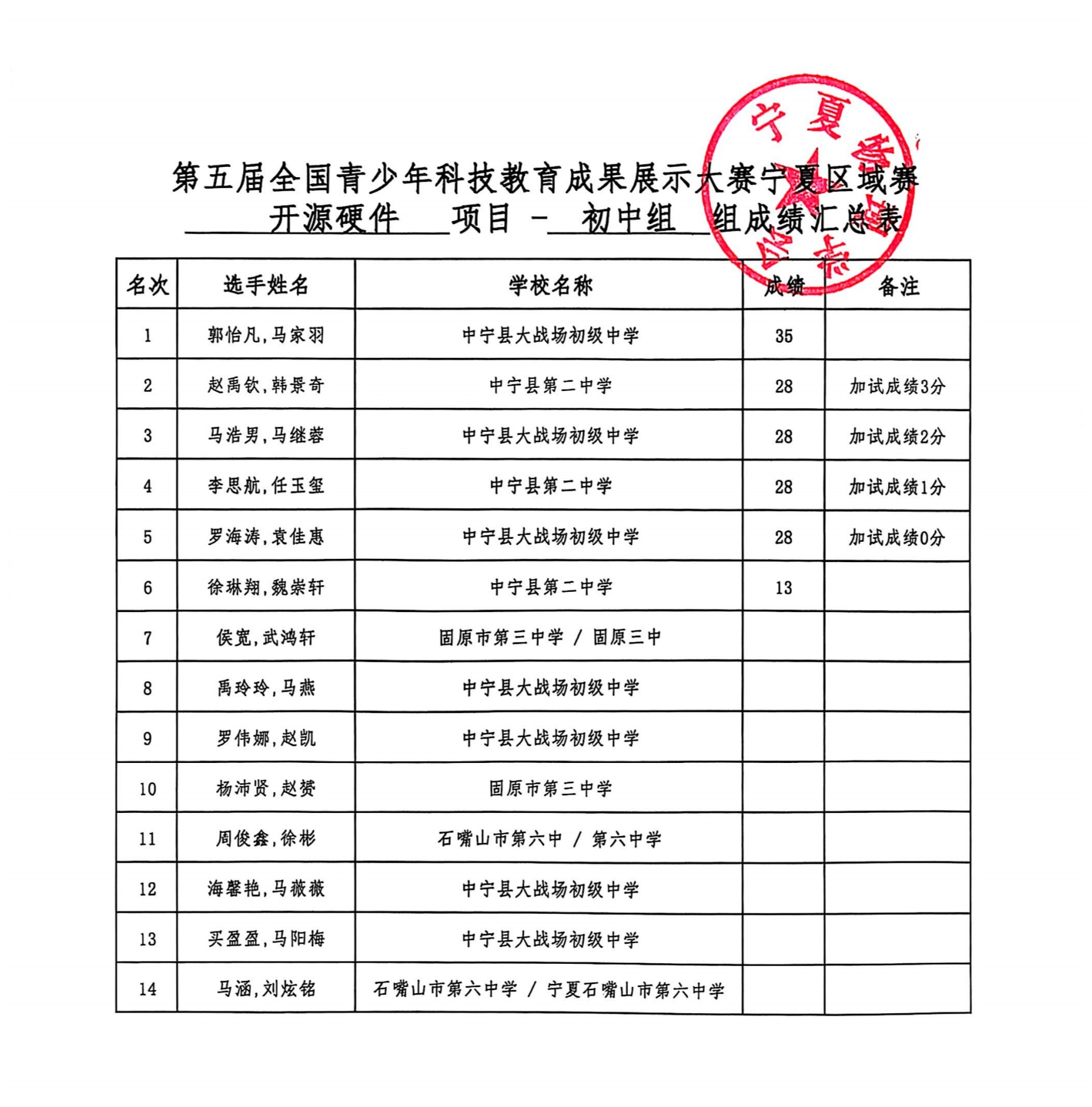 第五届全国青少年科技教育成果展示大赛宁夏区域赛线下赛项成绩公示