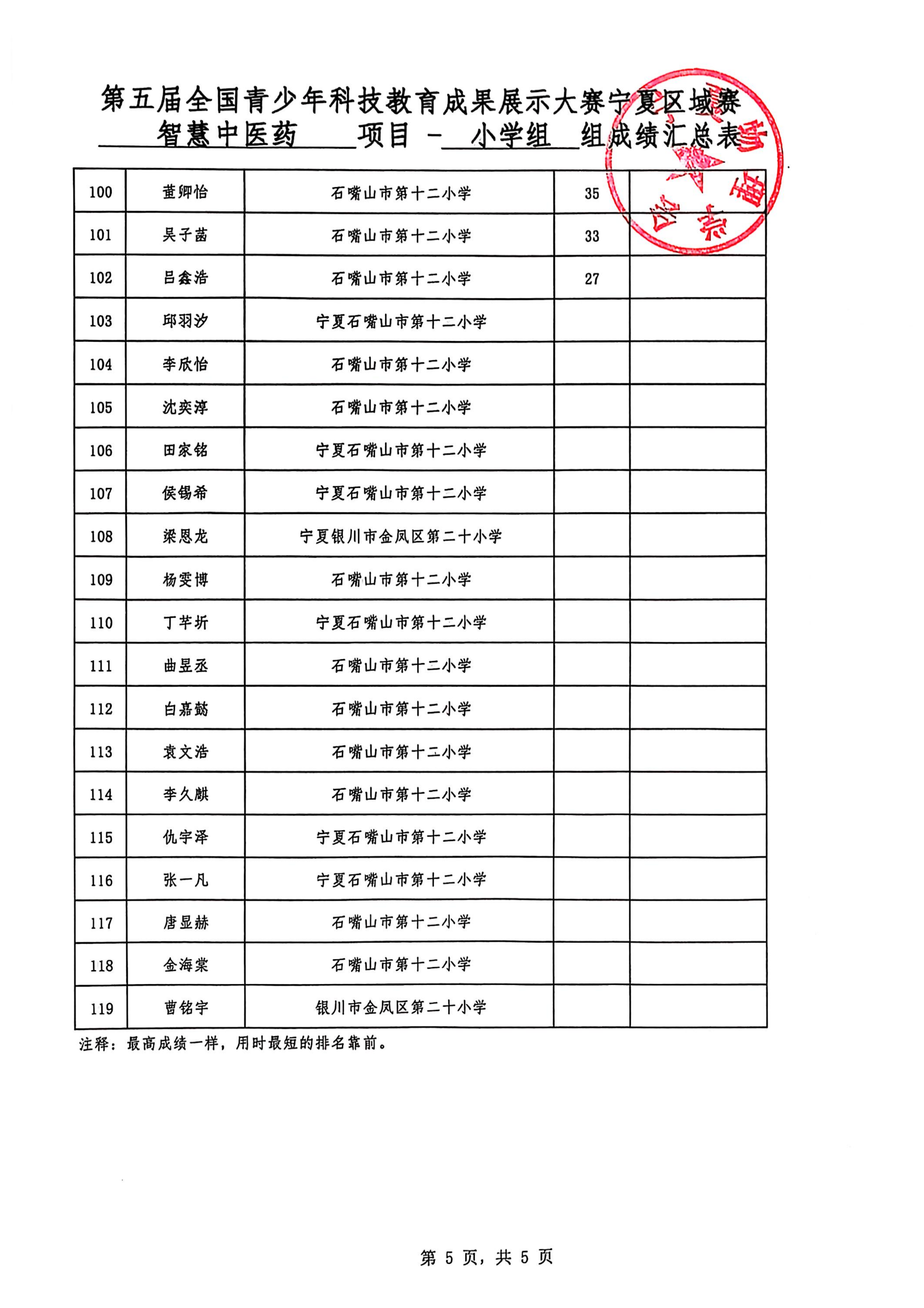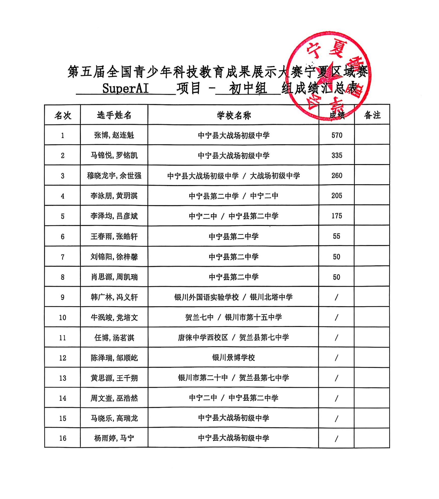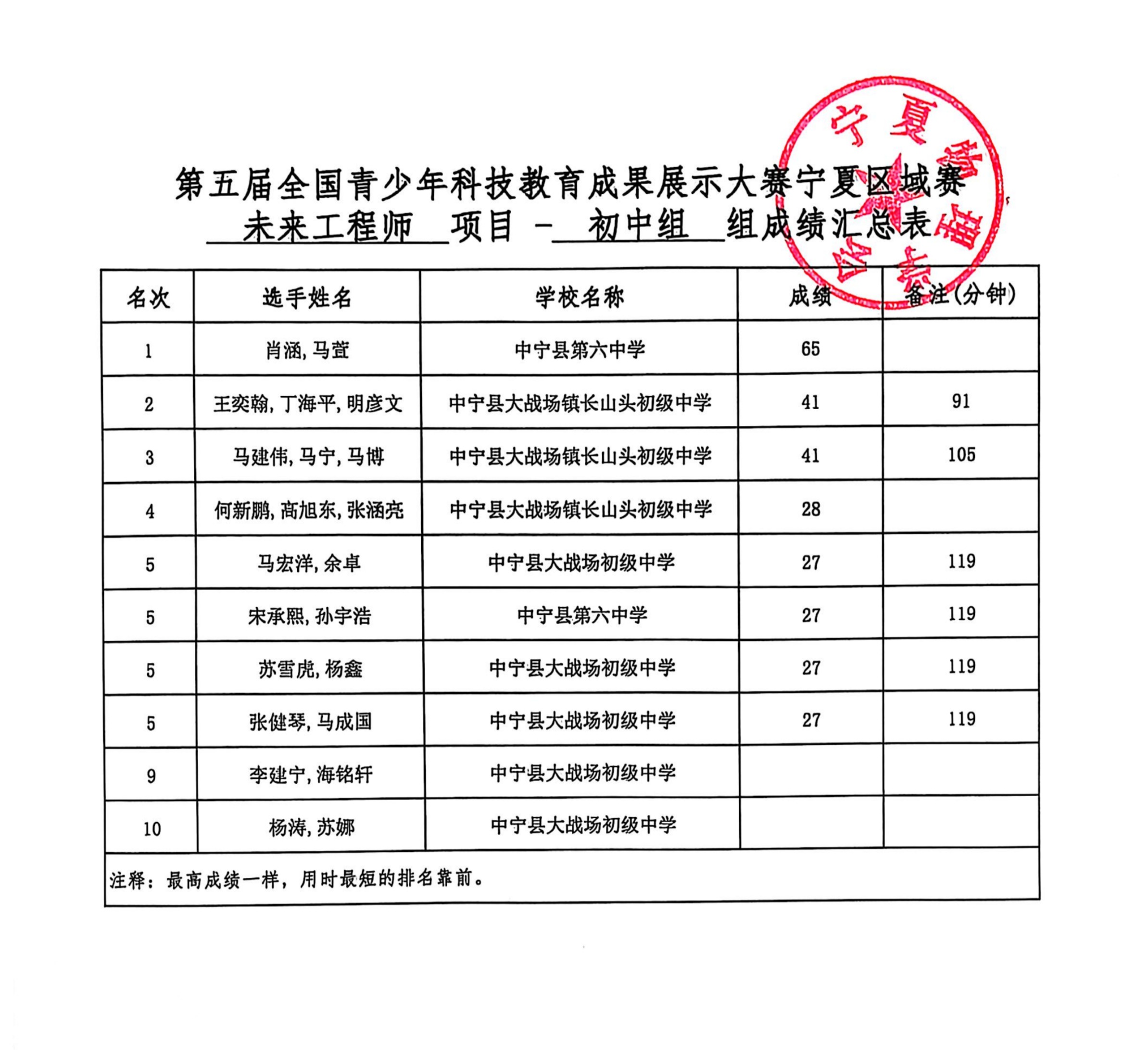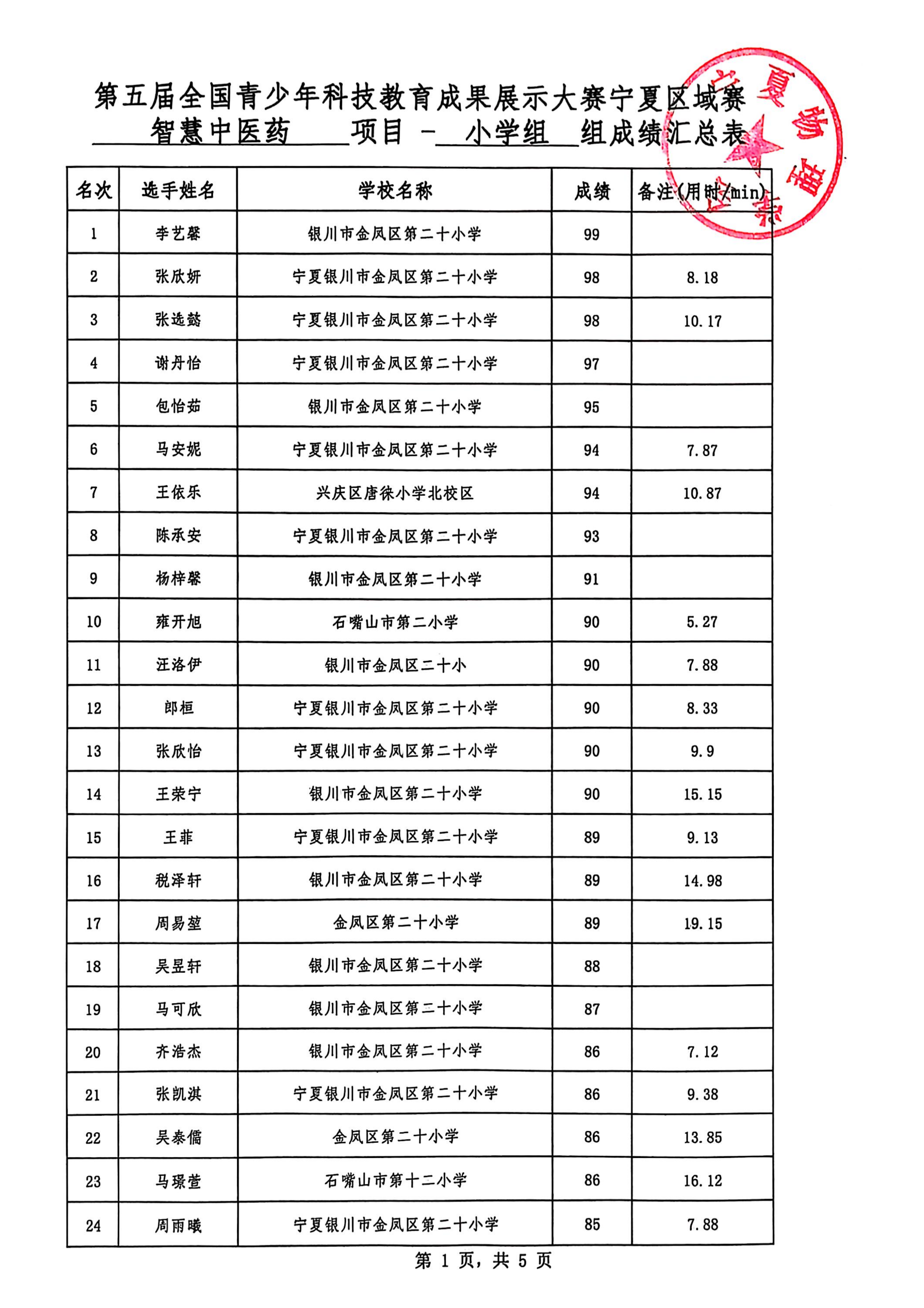 第五届全国青少年科技教育成果展示大赛宁夏区域赛线下赛项成绩公示