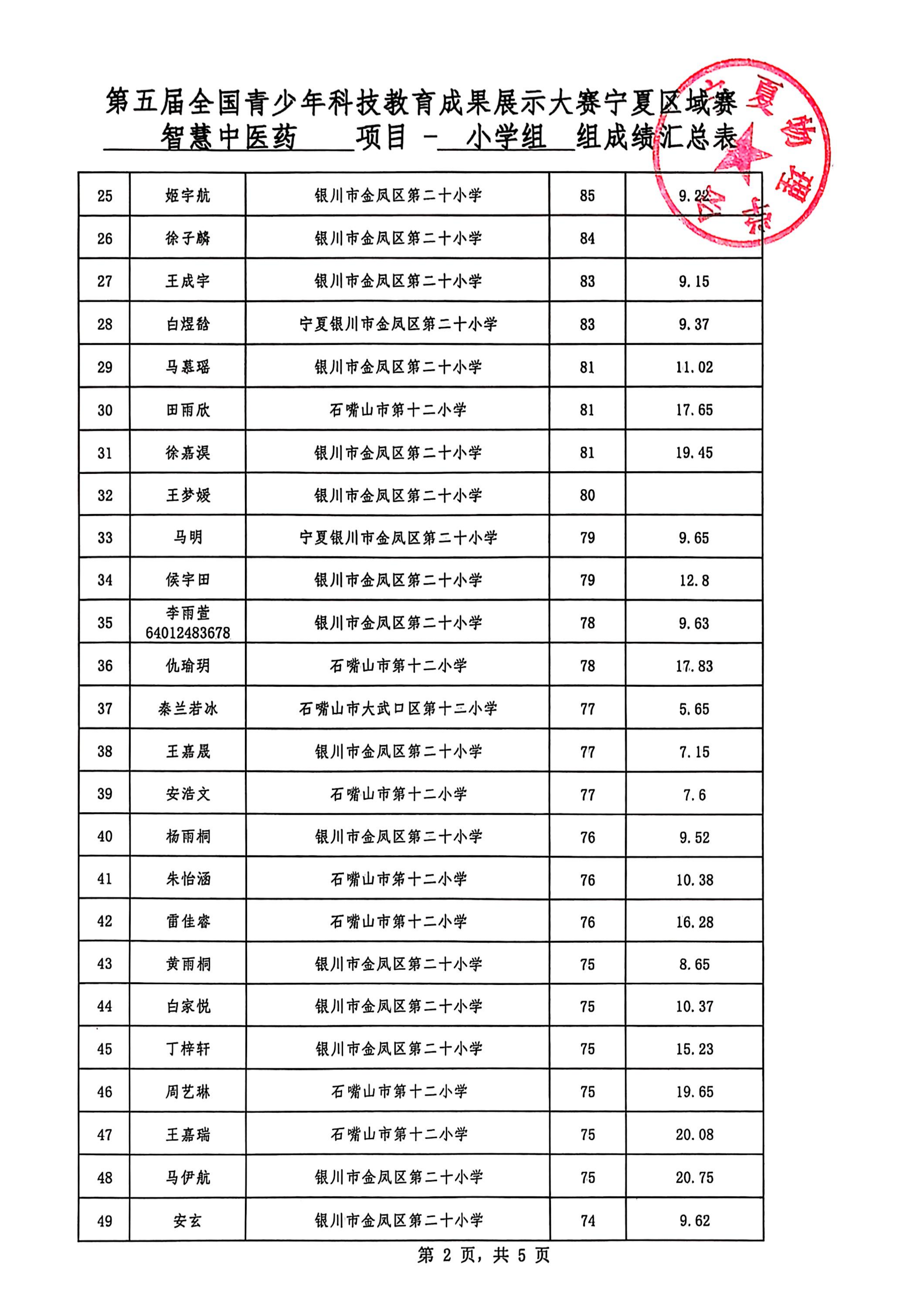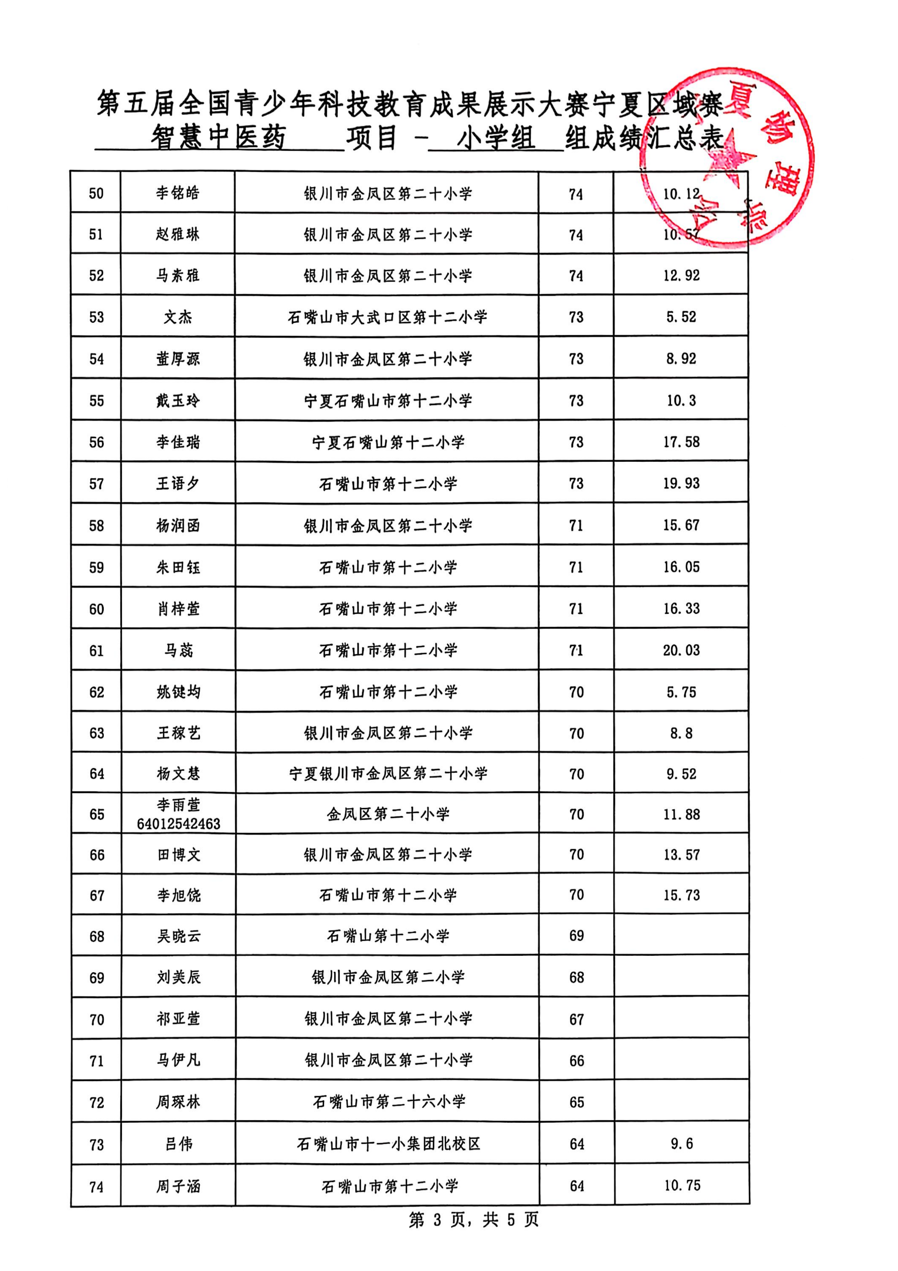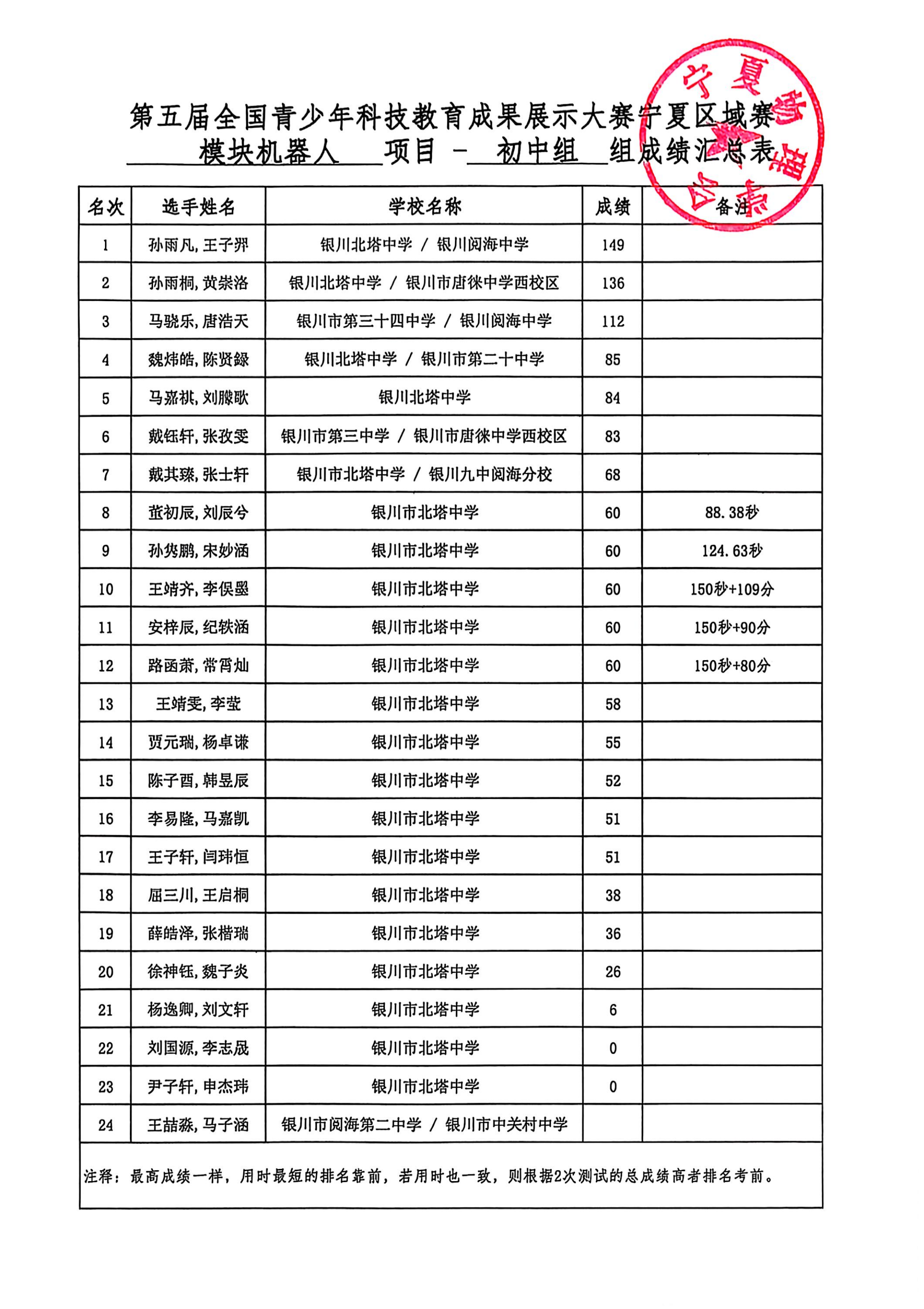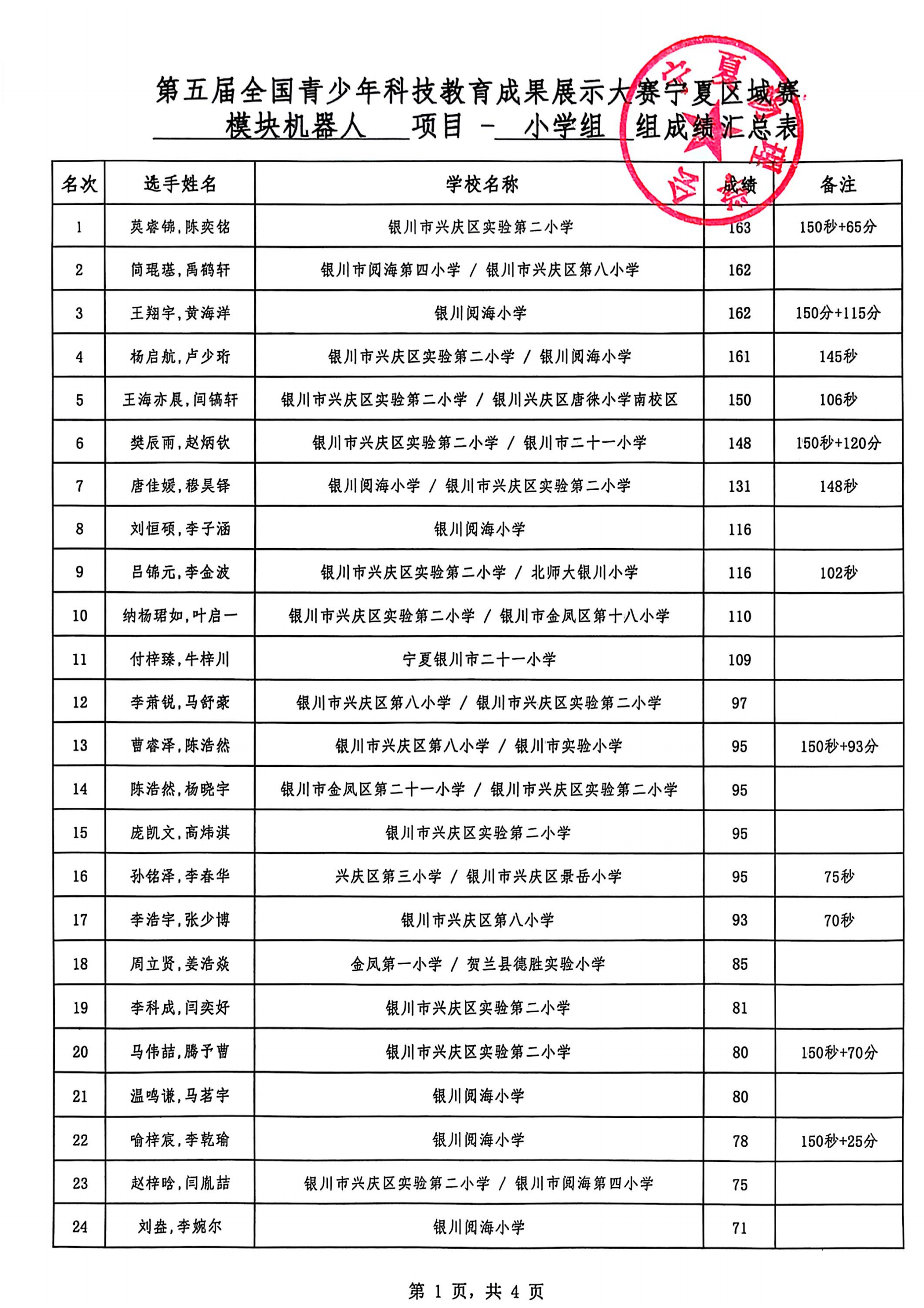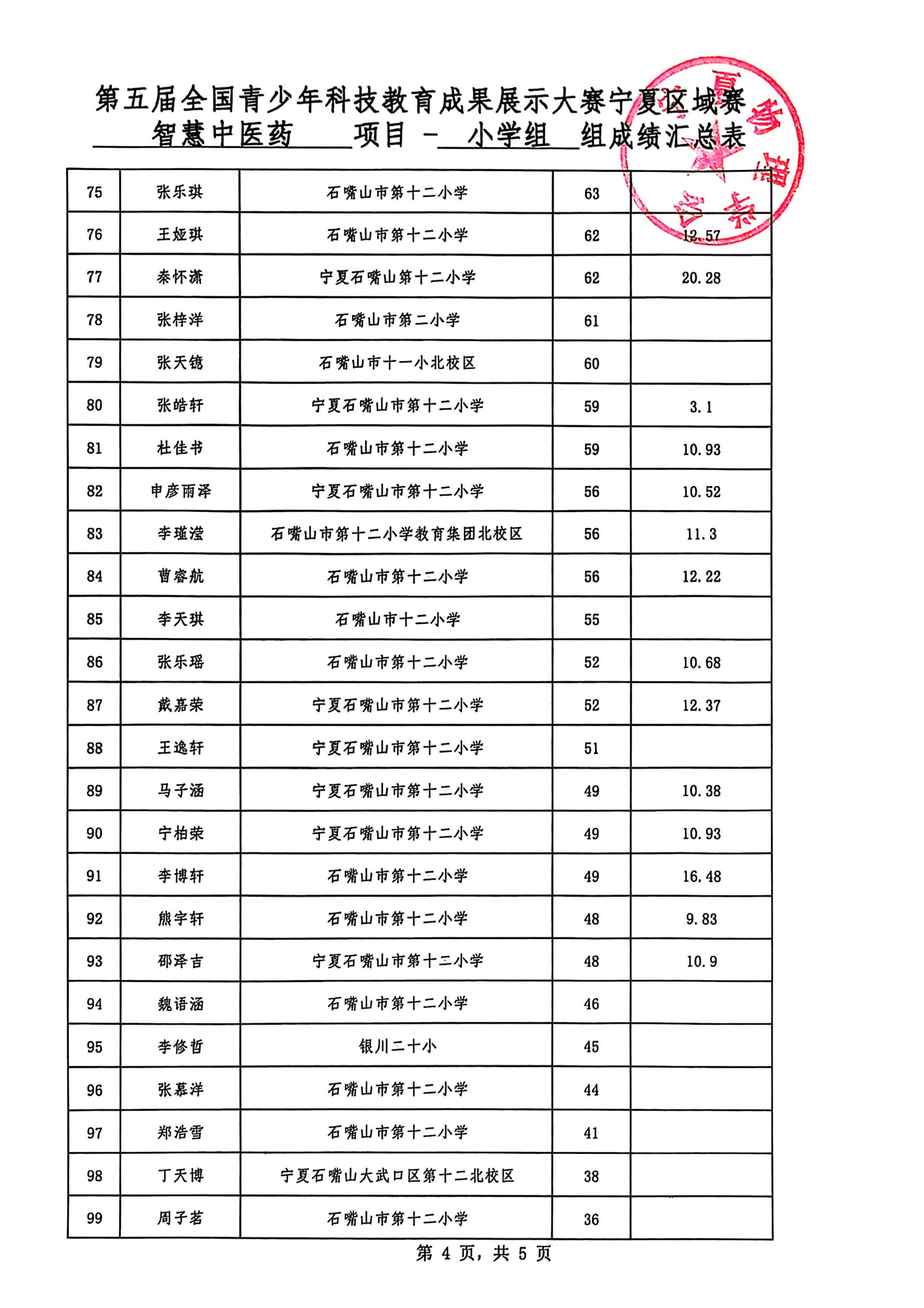 第五届全国青少年科技教育成果展示大赛宁夏区域赛线下赛项成绩公示